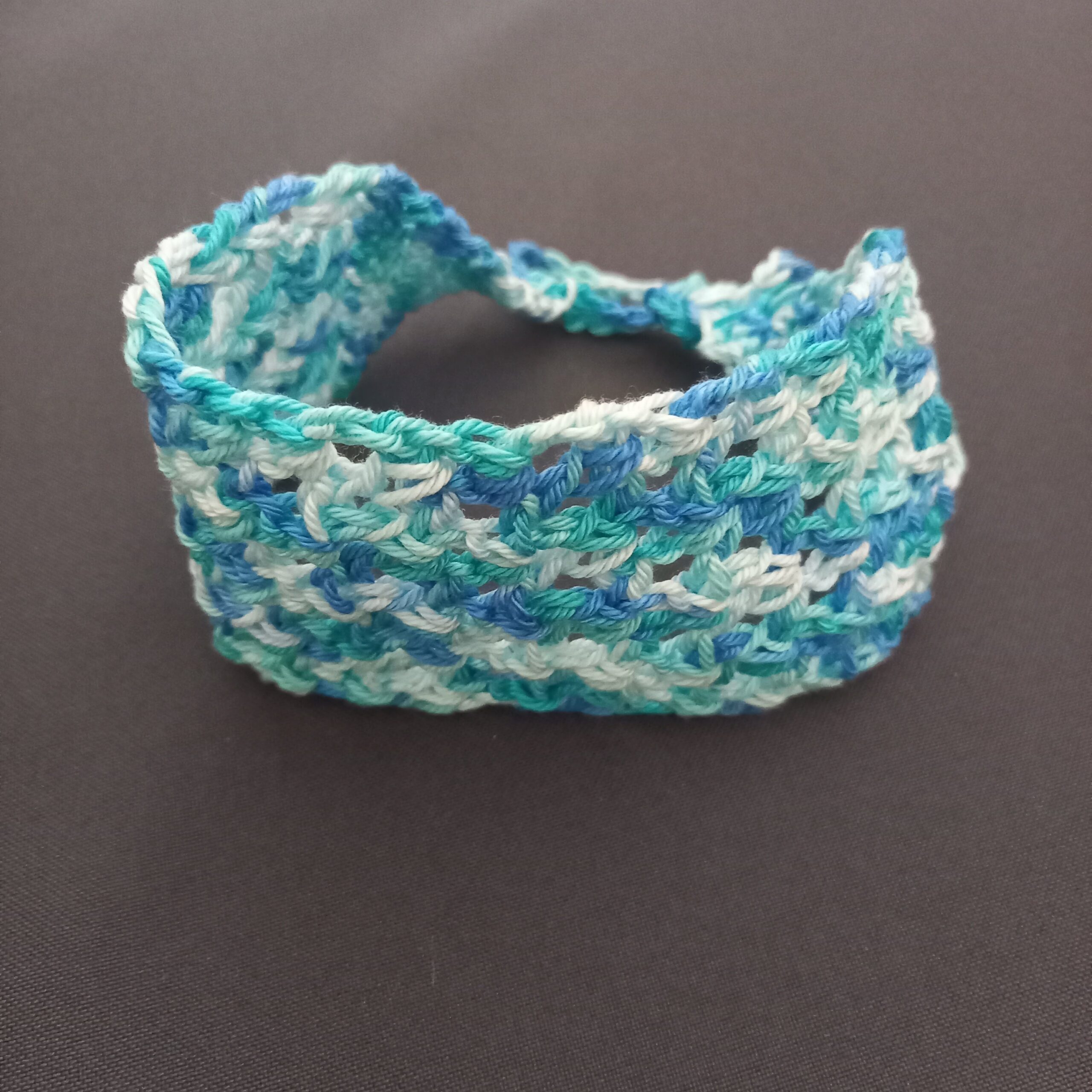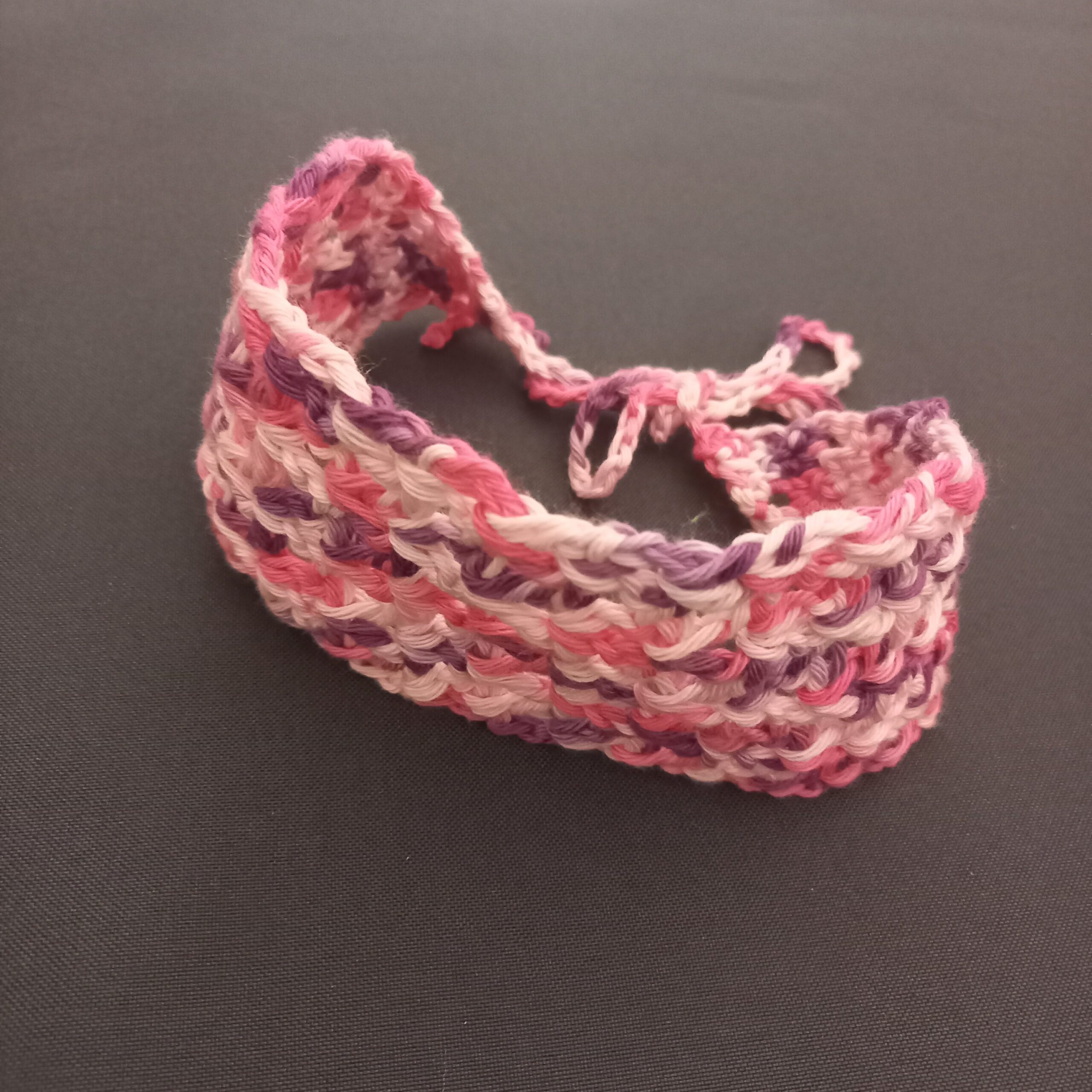 Gehäkeltes Haarband im Boho-Stil, mit den zwei Endbändern wird es im Nacken zu einer Schleife gebunden. Breite ca. 6-7 cm. Aus 100 % Baumwolle (40° waschbar).