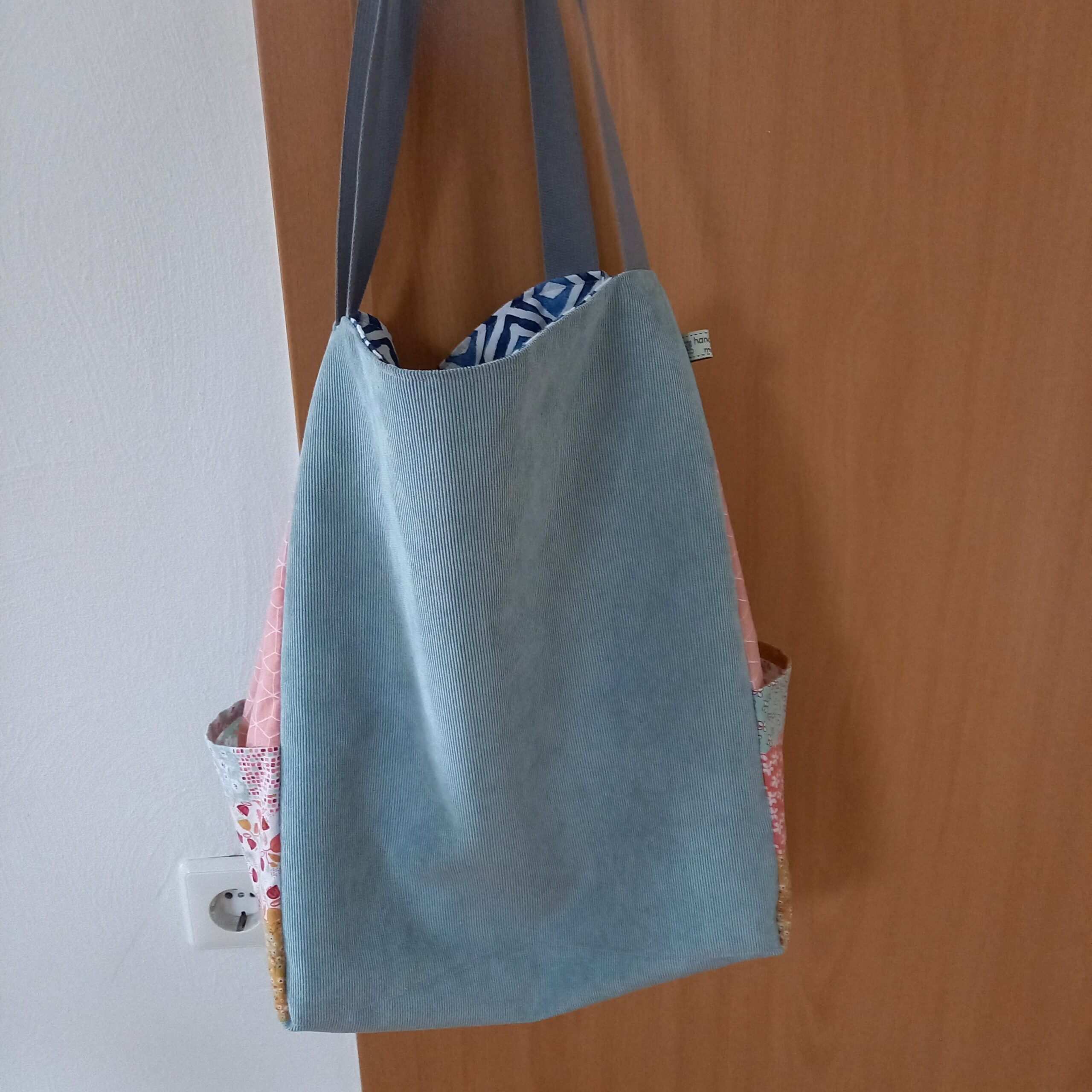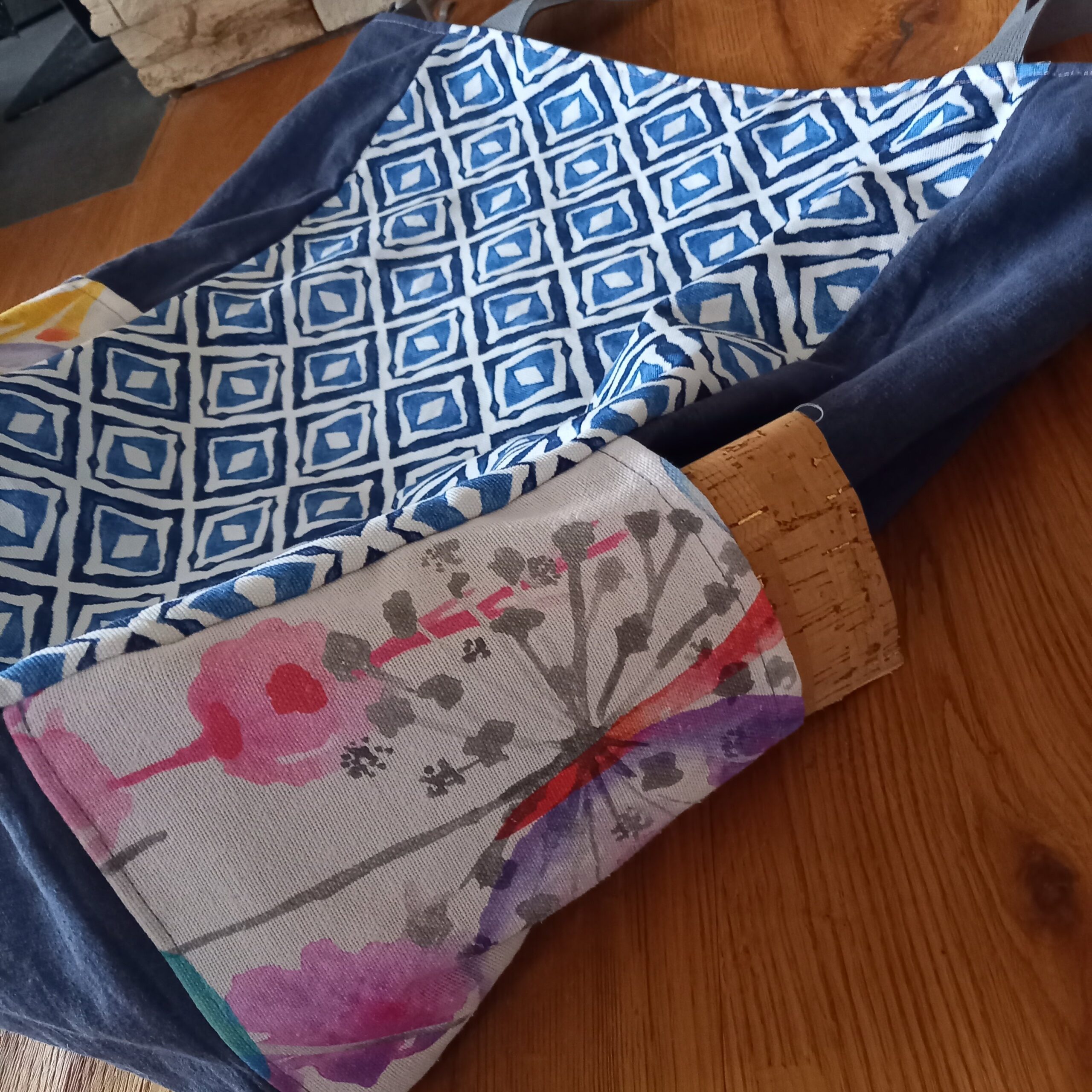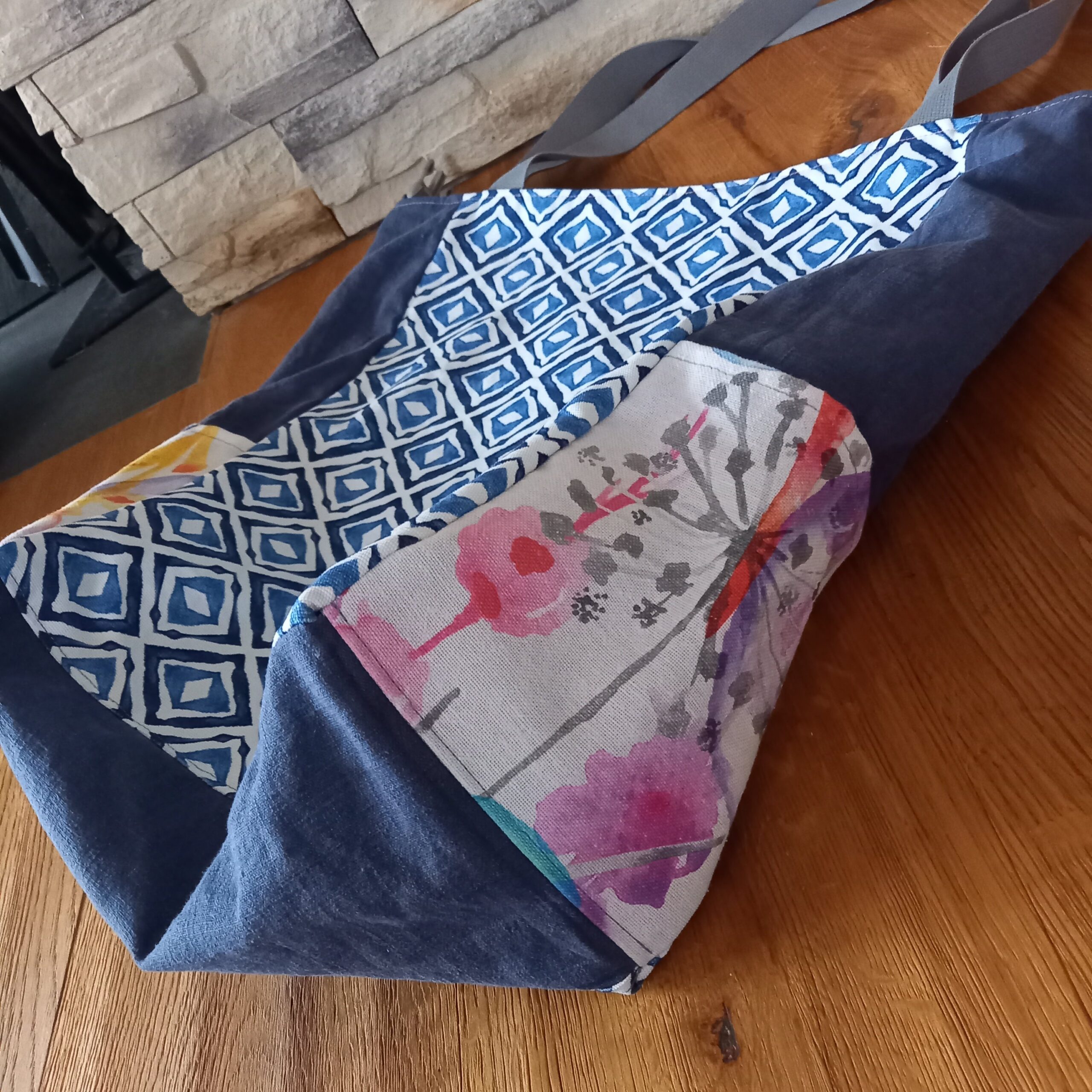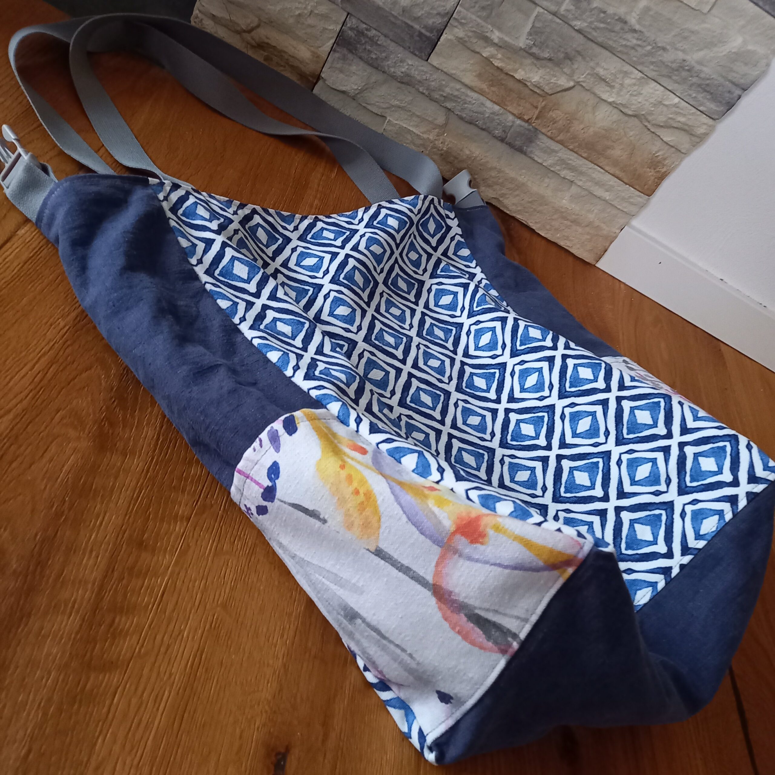 Trendige Stofftasche zum Wenden, geräumig, mit jeweils seitlichen Steckfächern für Accessoires oder kleiner Trinkflasche. Mit Steckschnalle zum Schließen, über der Schulter tragbar. Kann auf Wunsch noch mit weiterem Gurtband zum Cross-Tragen ergänzt werden. Maße ca. 41 cm H x 45 cm B, 12 cm. tief.