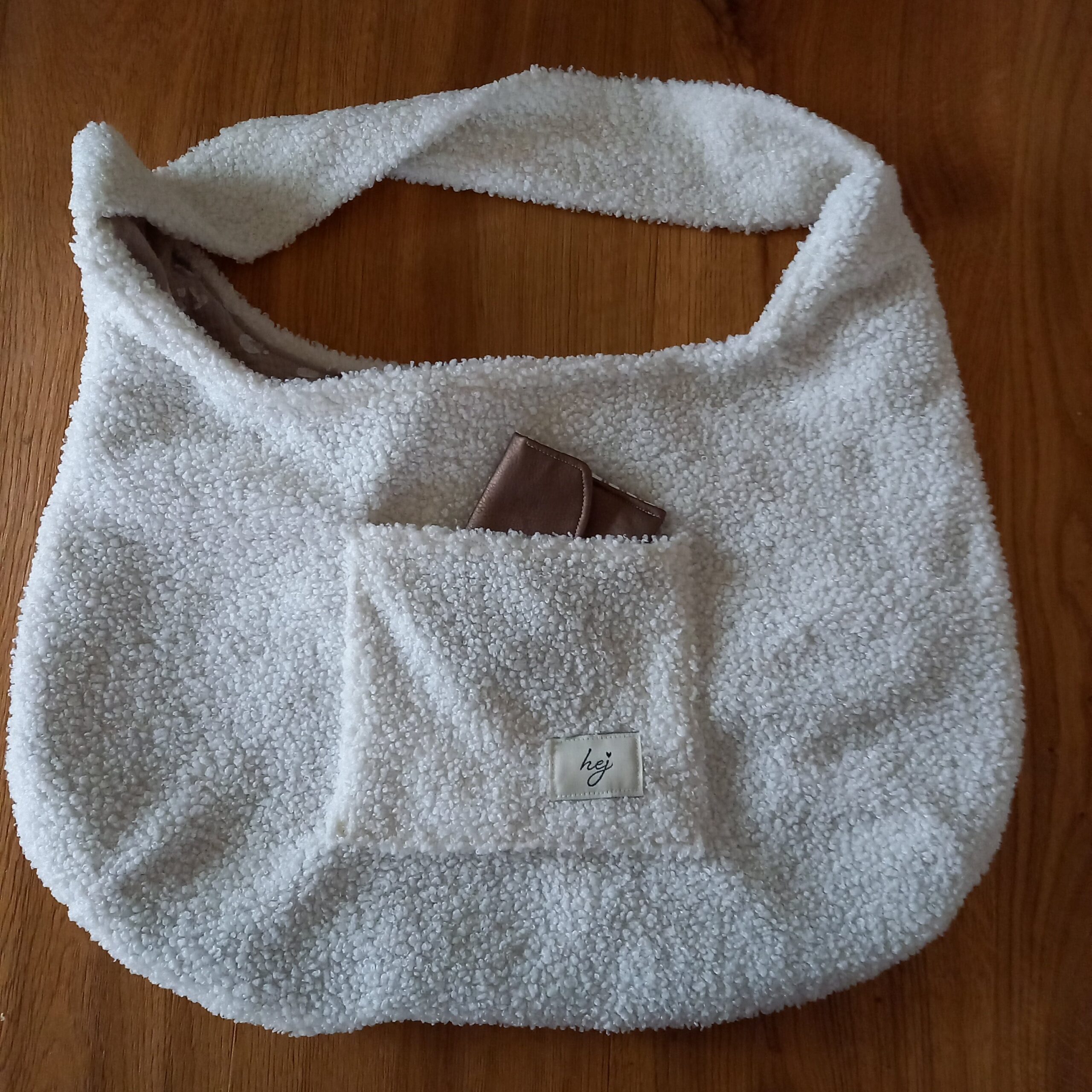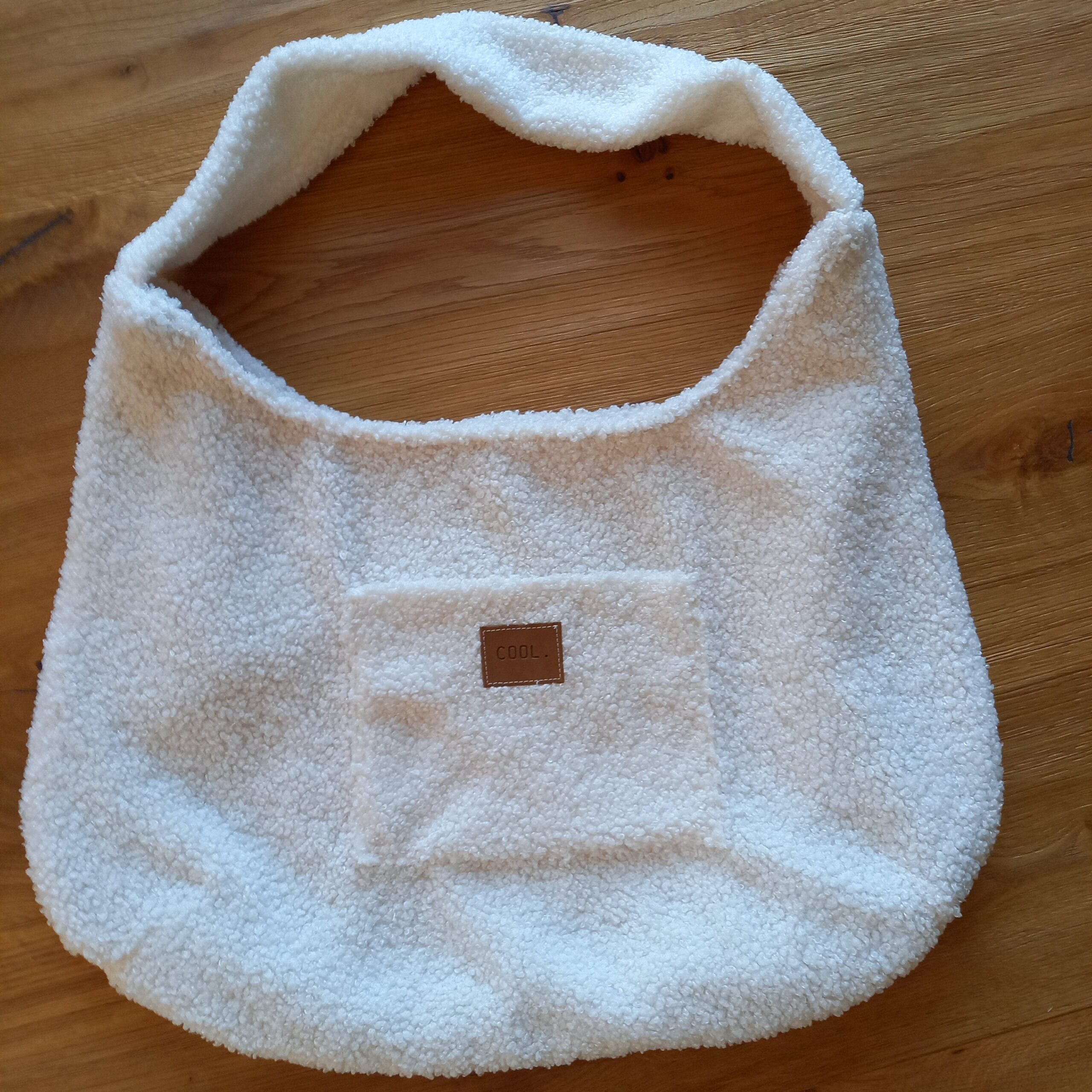 Weiche Schultertasche aus Teddystoff, mit Außenfach, Innenfutter mit doppeltem Innenfach, Magnetverschluss, ca. 47 cm x 31 cm, waschbar mit 30°.