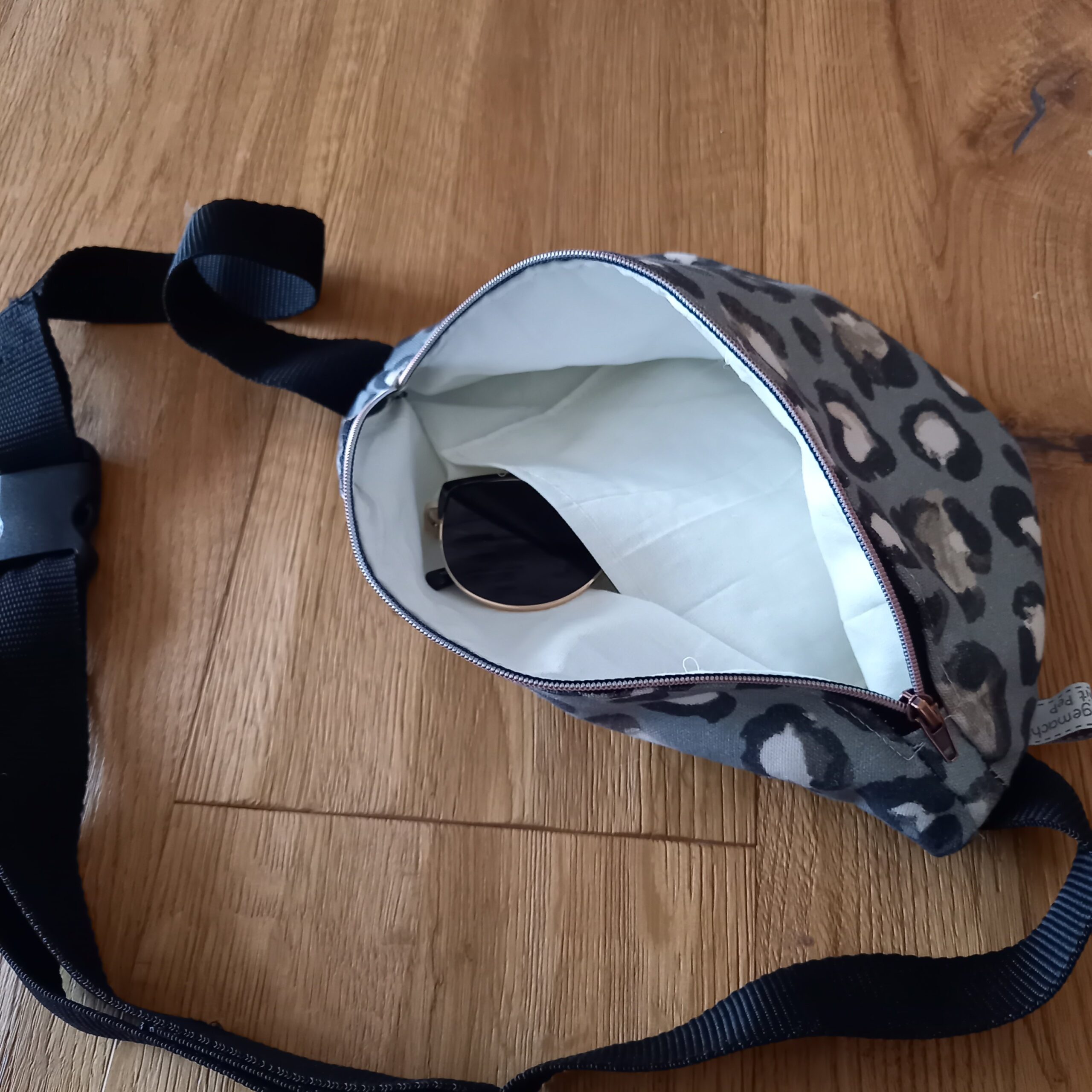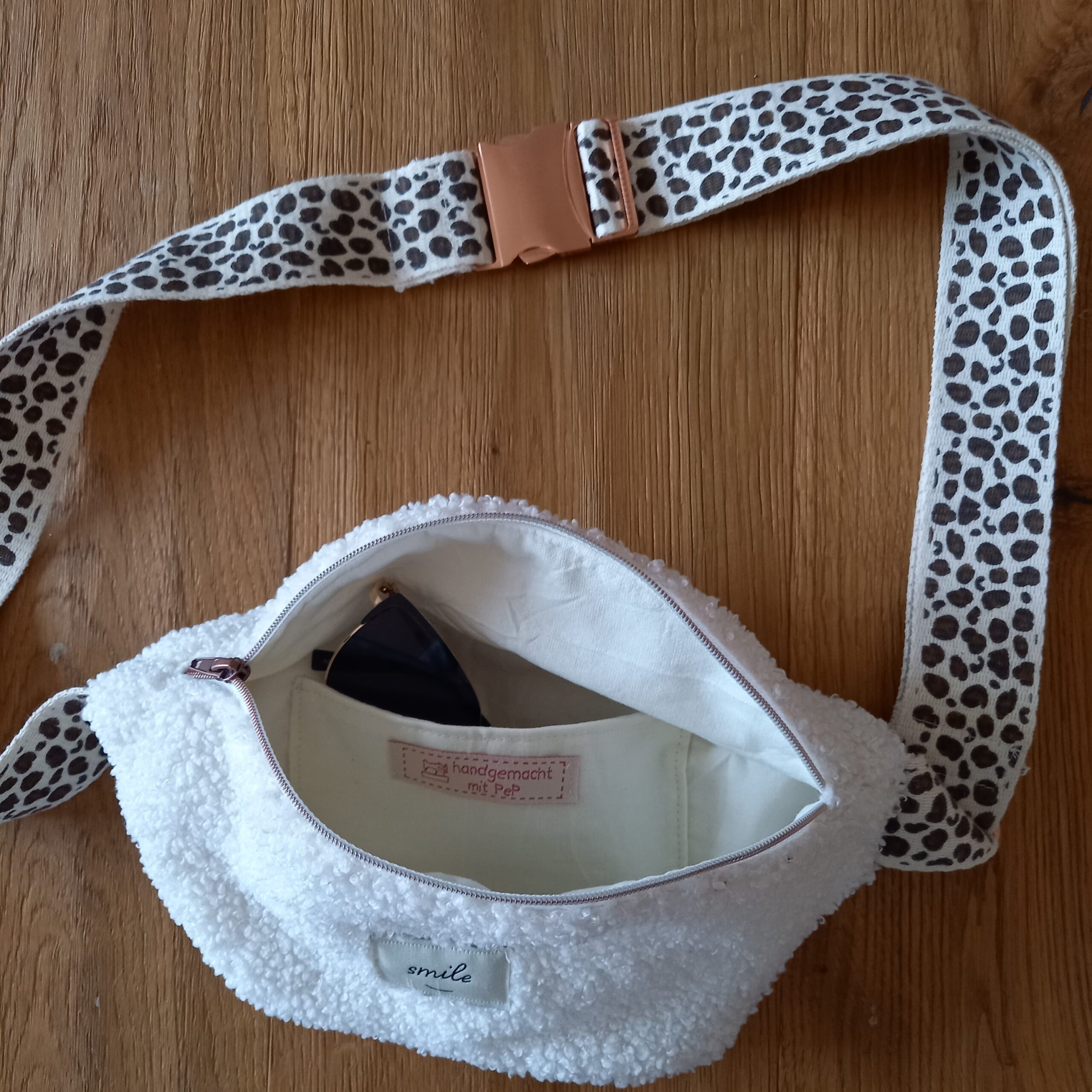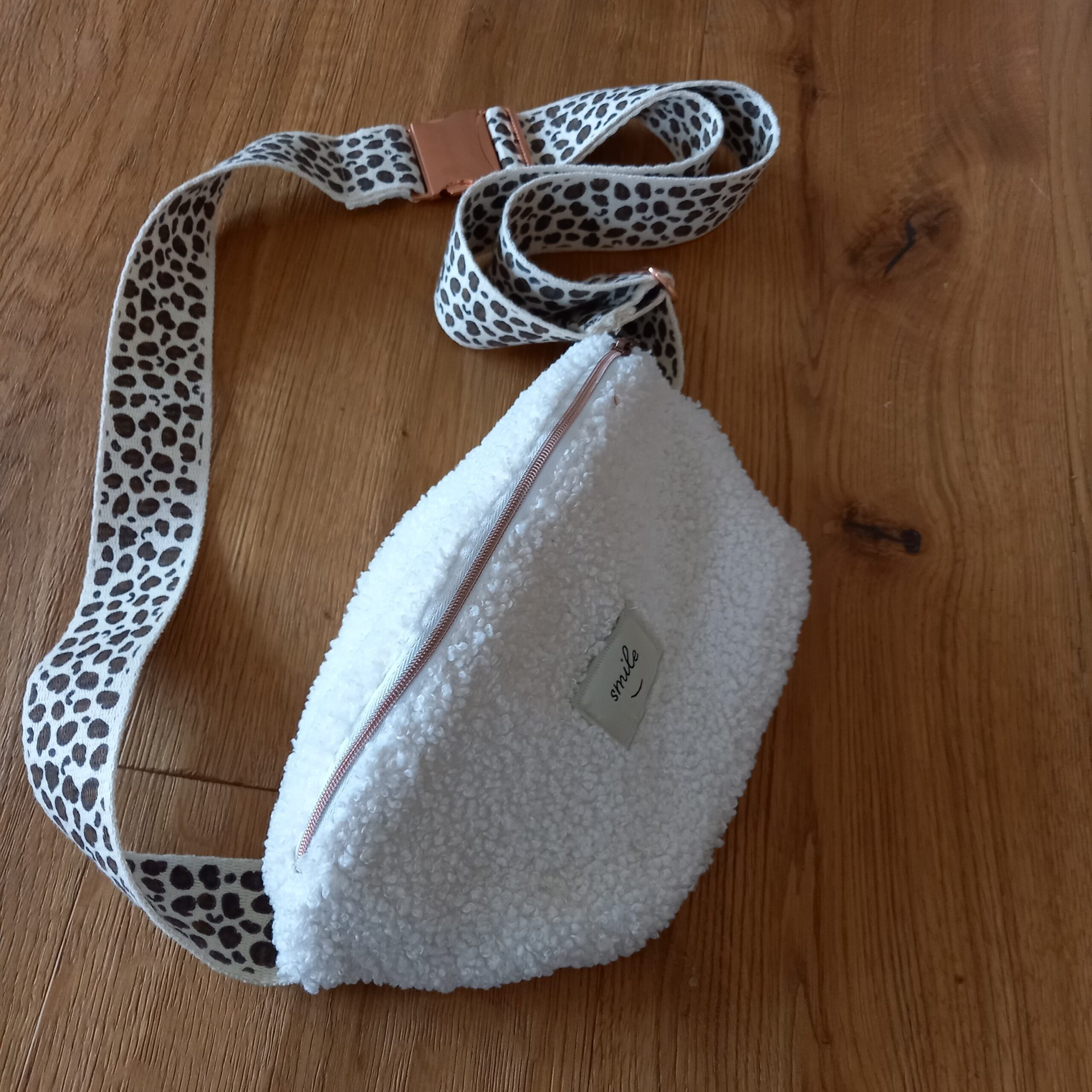 Bauchtasche – zum Cross-Tragen am Bauch. Mit Innenfutter und Innenfach. Die Teddytasche hat ein braun-naturfarbenes Leo-Gurtband (4 cm breit) mit kupferfarbenem Messingverschluss und einen weiß-kupferfarbenen Reißverschluss. Die Leo-Tasche hat ein schwarzes Gurtband (3 cm breit) mit schwarzem Kunststoffverschluss und einen schwarz-kupferfarbenen Reißverschluss.